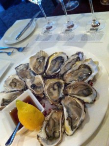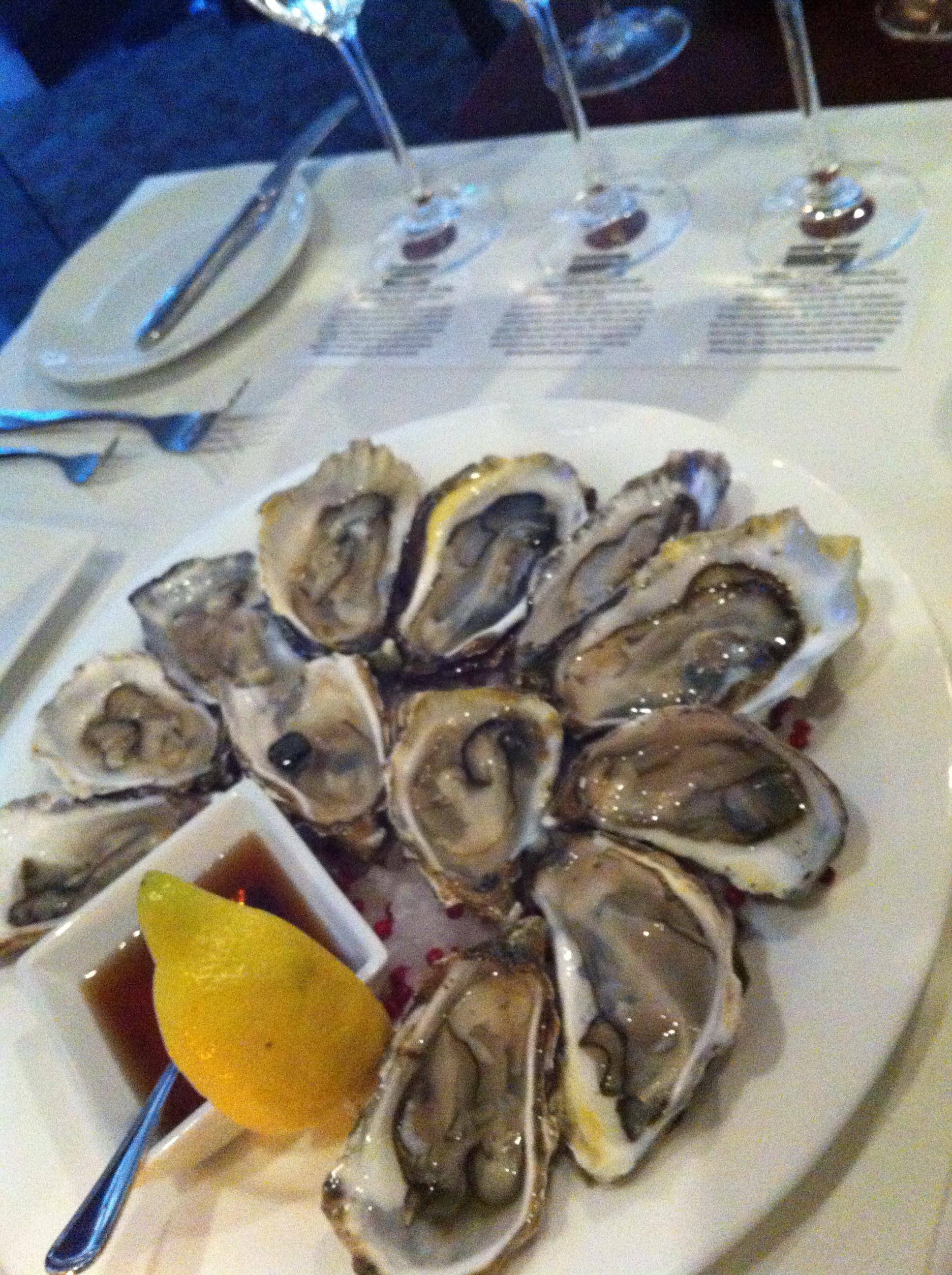 And what do you have to drink with oysters? Bubbles, of course! This was their flight of bubbles, and at $12.50, I believe, it was well worth it! On the left is NV Varichon & Clerc Privelegè, a blanc de blancs brut from Savoie, France. Pale in color, refreshing and light. Next was a 2009 Gérard Bertrand Crémant de Limoux brut Rosé from Limoux, France. Last was a Pierre Morlet Grand Réserve Premier Cru Brut from Aveny-Val-d’Or. Here’s the Wikipedia entry on champagne for the deets on the different kinds.
