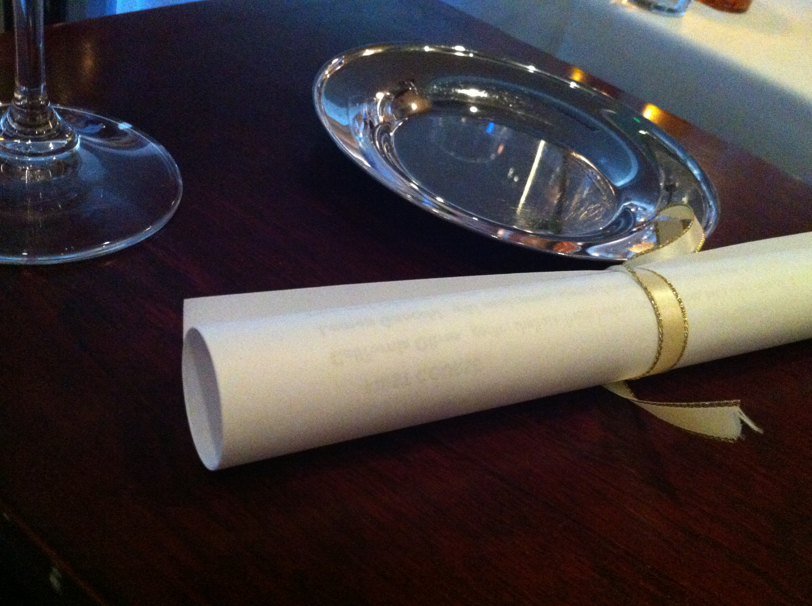 I can’t even begin to tell you how stellar the service is at this place. Ramon was absolutely flawless, as were the support staff. He even recommended a place for us to go hiking on the coast near Cowgirl Creamery. What sent me over the edge was when I asked for a menu and he returned with it, presented like this: