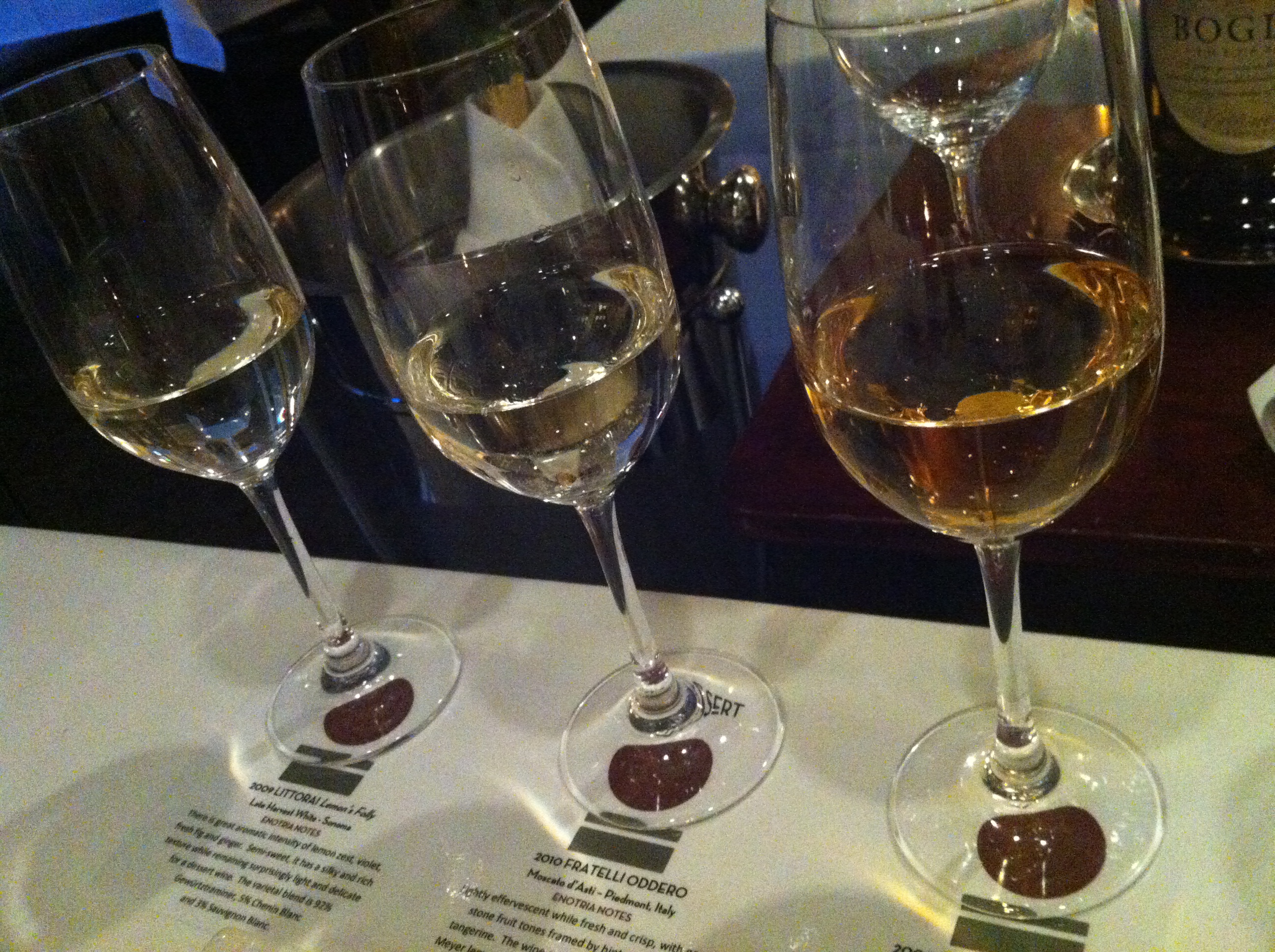With the cheese platter came our final wine flight of dessert wines. 2010 Fratelli Oddero, a Moscato d’Asti from Piedmont, Italy. Next is a 2000 Terrabianca Il Fior di Fino, Trebbiano/Malvasia from Tuscany, Italy. And finally a 2009 Littorai Lemon’s Folly, a late harvest white from Sonoma: 92% Gewürtztraminer, 5% Chenin blanc and 3% Sauvignon blanc. I think of these, I liked the Moscato the best.