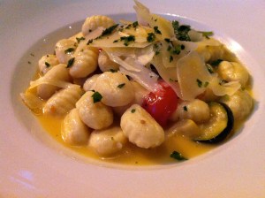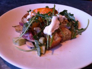 Instead of sitting in the regular dining area, we got to sit at the bar (not the boozy one), also known as the chef’s table. It’s butted up next to the kitchen and is where the “cold” stuff happens: salads, desserts, the cheese plate… those sorts of things. We watched the chef adroitly mandoline slice squash, wondering if she’d ever sliced off a piece of her fingers… hoping that if she did, it wasn’t into our salad. The silverware is also kept within the bar-height table, so there are alsways servers hustling to and fro, so service here was super quick and excellent. Our bread got refilled at an alarming rate, our water glasses were always full, and it was a great spot to watch the near-misses of servers running out of the kitchen door and others running towards the fridge at the back of the wall.