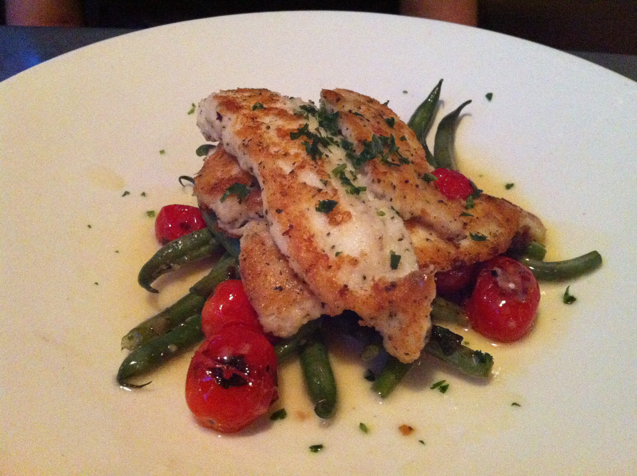 Another hearty portion! I’m a huge mushroom fan and I’ll take them almost any way I can get them! The ravioli were stuffed with a mixture of mushrooms, cheese, and some other ingredient I couldn’t quite put my finger on. The overall effect was texturally a little off for me. The flavors were fabulous, but it almost seemed like the balance and consistency weren’t quite right: too much mushroom in one ravioli, not enough in the other, etc. There was lots of parmesan on top, which I loved, and the leeks added a nice sweetness to the overall dish. While I liked this very much, I think I probably ate more of the trout. I mean, ravioli reheats so much better for tomorrow’s lunch, right?!
