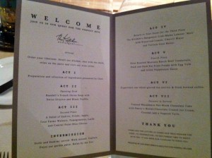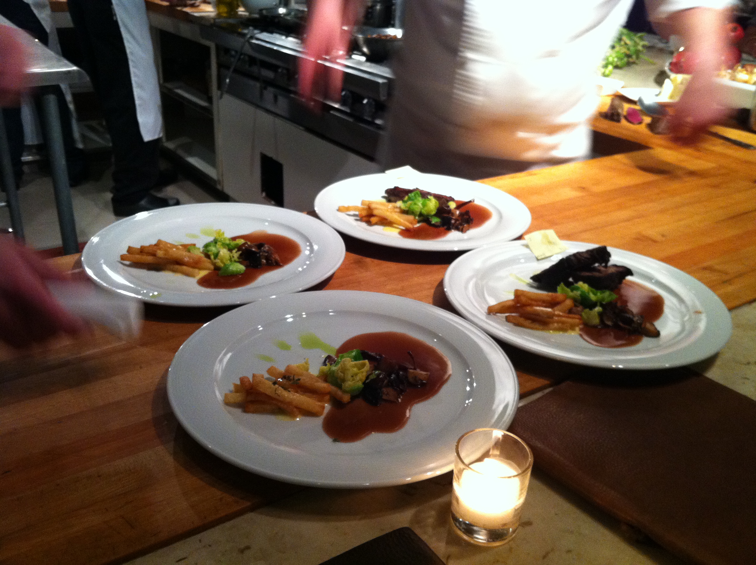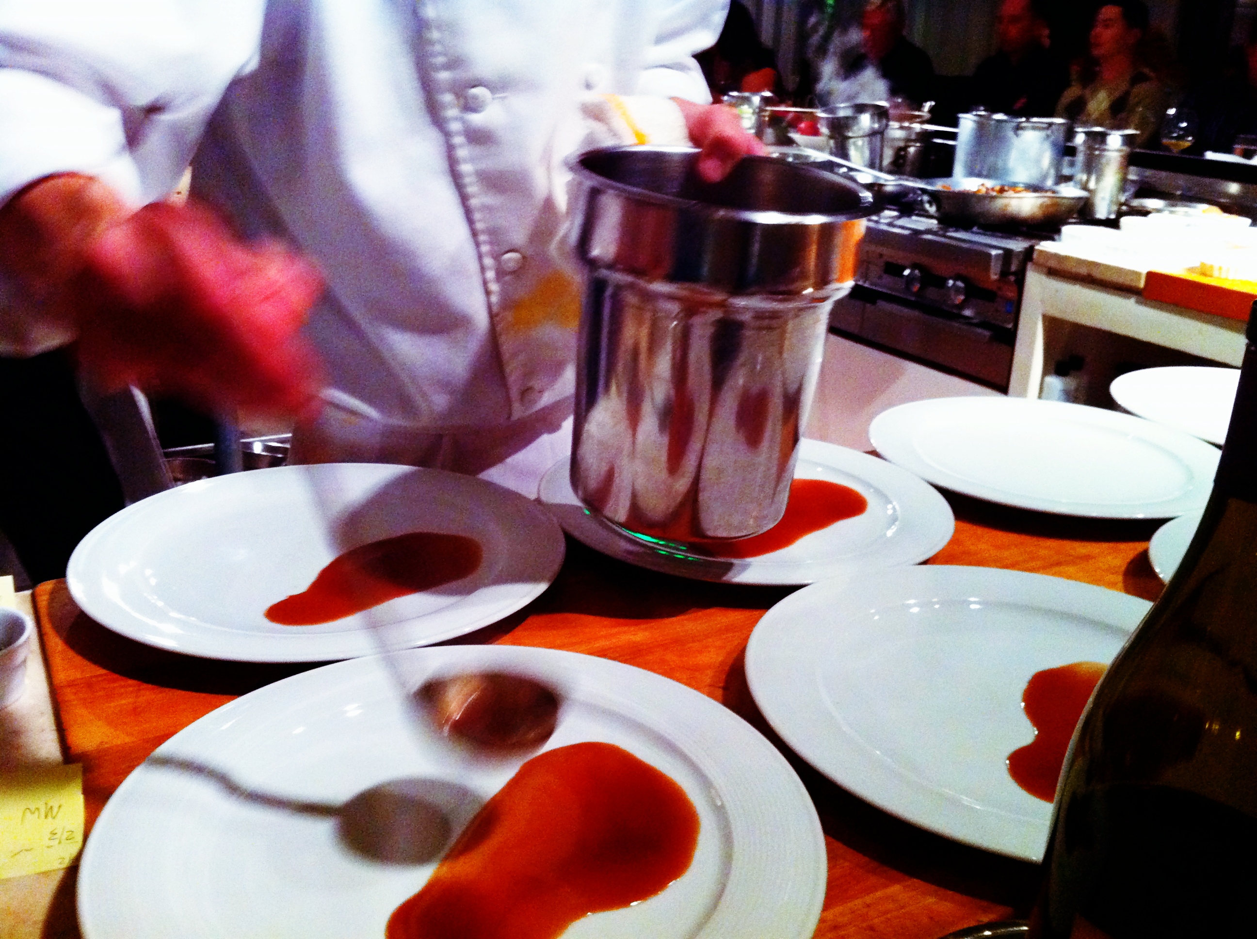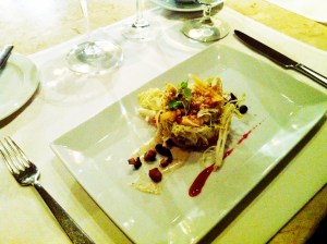 The second course was a sous vide and seared Passmore Ranch sturgeon perched atop a Tasso-braised rainbow chard, surrounded by a pillow of buttermilk parsnip puree and sunk in a lake of sauce almondine. If you’re wondering what the heck “sous vide” means, check this out: http://en.wikipedia.org/wiki/Sous-vide. It was paired with an Orvieto, which is both a growing region in pretty much the middle of Italy, and what they call the wine from that area. It’s a dryer, less sweet wine, and not as heavy or buttery as a lot of chardonnays these days. I enjoyed this dish, but thought it was a tad heavy on the almonds. The puree was smooth, buttery, and was the “glue” that tied in all the flavors. The sturgeon was perfectly prepared.