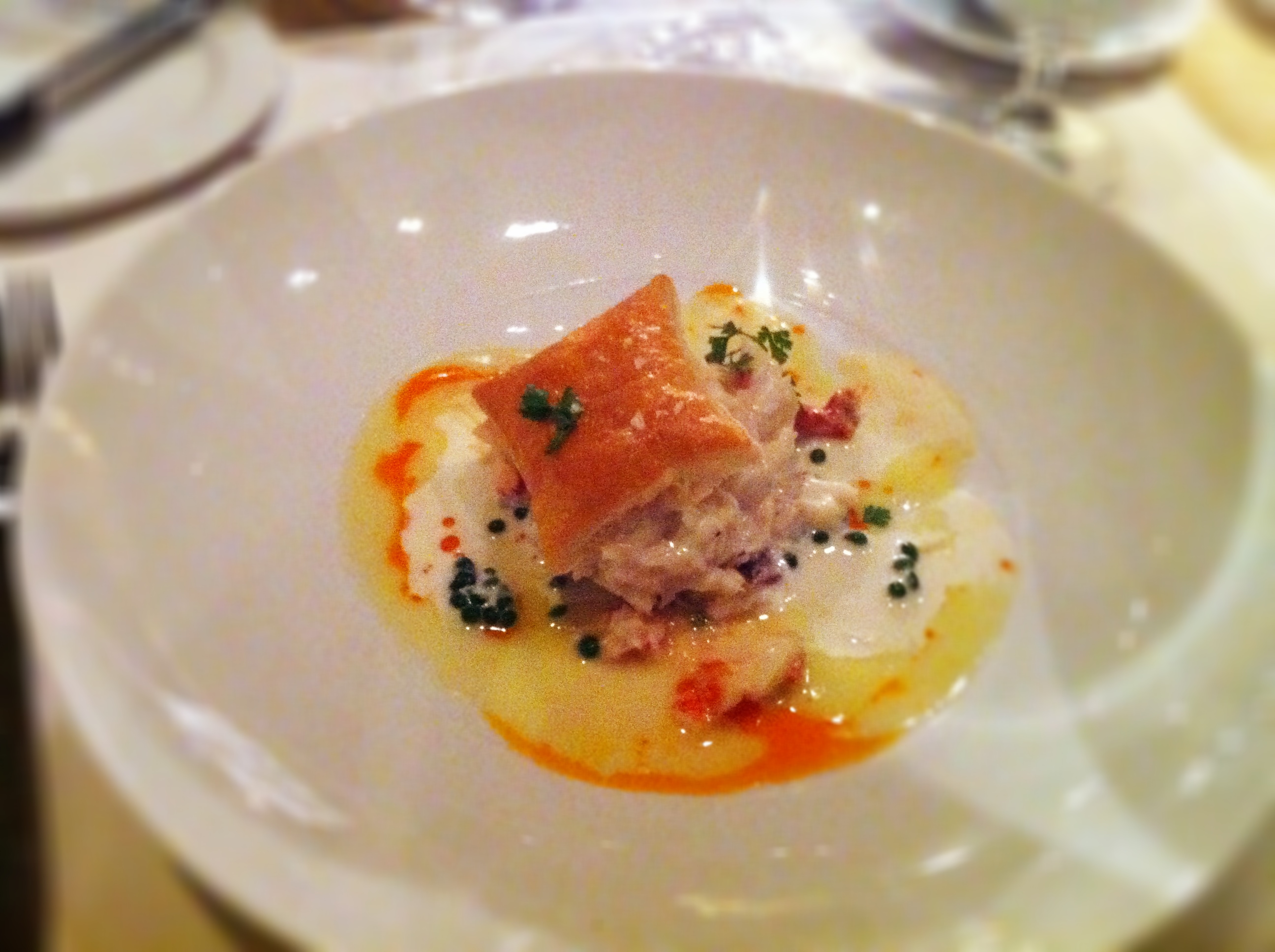 My first course was a beet salad with pistachio-crusted goat cheese, arugula, blood oranges, fennel, tossed with a golden balsamic vinaigrette and paired with a sauvignon blanc. The goat cheese was fabulous. I loved the crunchy texture of the pistachios as a counterpoint to the smooth goat cheese. Calling this a “beet” salad was a bit of a misnomer, however, as it was mostly arugula. I really enjoyed this. It was perfectly dressed and the crouton was also a great addition to add a little bit more crunch to the overall dish.