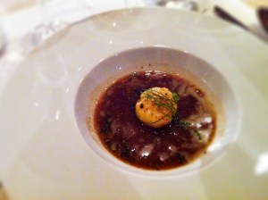 The first course: 12 Hour Beeler Ranch pork belly with apple “3” ways, parsnips, and bulls blood. This was paired with a chardonnay. Obviously I didn’t order this, so I can’t speak for its flavor or texture. Needless to say, it was a hit with the person who ordered it.