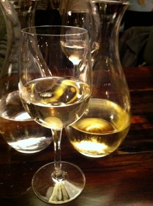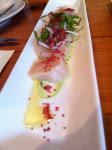 Second up was kampachi. Kampachi is a kind of yellow jack or amber jack and reminiscent of Tai, or red snapper, but much softer. It is a white fish, with a mild flavor. Hock Farm prepares theirs raw (best choice), with avocado, thinly sliced red radish, a piece of celery heart, a Marcona almond, smoked sea salt, and lemon infused olive oil. All components came together for a wonderfully rich mouth feel and flavor party. The kampachi is pretty mild, but provides a gentle fishy taste, along with a firm texture. I loved the spicy feeling the radish lended, while the almond was a fabulous textural and flavor addition. The smoked sea salt was really fabulous, giving each bite a wonderfully unexpected dimension. The avocado gave unselfishly of itself. The fat content made the mouthfeel rich and sensuous, while the flavor tied all the others together. The only thing I would say about this was that you need just a little bit of avocado to accomplish this. The amount in each bite of kampachi was a bit much. Just cut it into a third and give that a try.