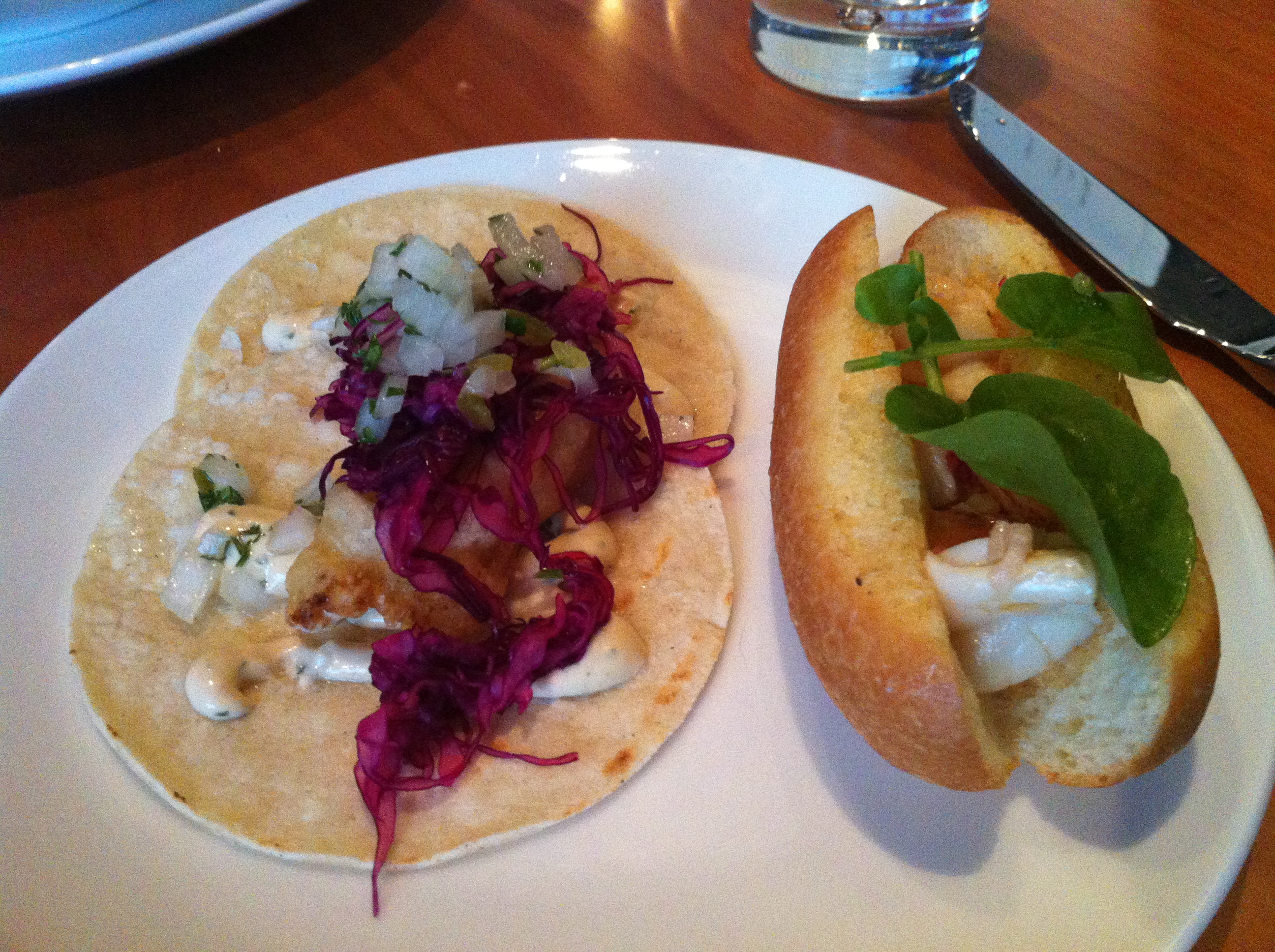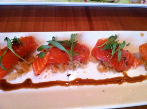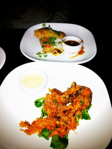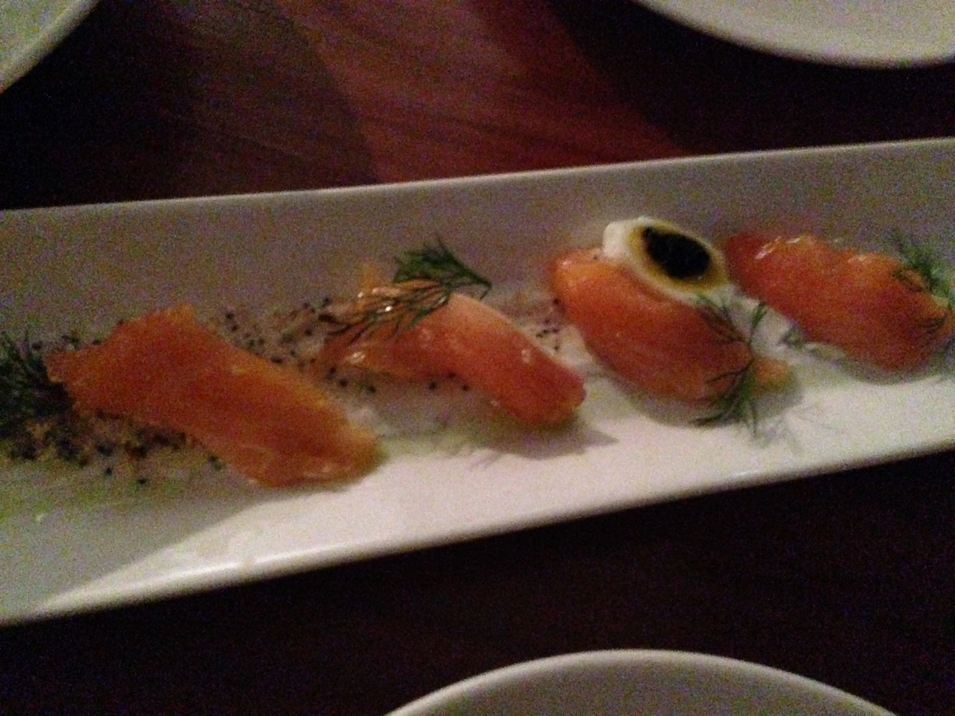 Second, was smoked salmon croquettes. Holy hell these were tasty. With a bit of dilled creme fraiche and some chives, this was insanely yummy. Instead of the usual reaction of “where the hell is the fish,” this had clear, obvious, and visible pieces of salmon. The croquettes were perfect spheres of crunchy goodness. They weren’t greasy, but had just enough crunch to give them the textural desire of a croquette.